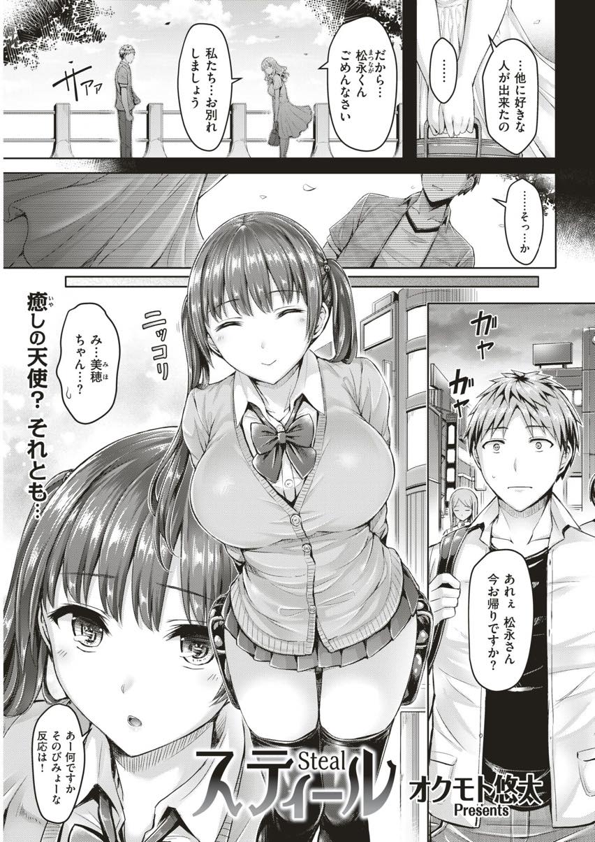 モテるお姉ちゃんへのあてつけで姉の彼氏・松永に近づいた爆乳JK・美穂。そんな彼女は一見、癒しの天使の様だが実は魔性の小悪魔だった!いつしか、松永に本気になった美穂は、流されやすいお姉ちゃんの性格を利用して、姉に惹かれていた自分の家庭教師を紹介して後押しする!そして二人を別れさせる!他に好きな人が出来たと姉に言われて、フラれた松永を待ち伏せして家にお邪魔する美穂!無防備な体勢でベッドの上に横になり、パンチラで誘惑開始!実は未だに童貞だったと分かると、大股開きで股間を見せつけて足コキ!豊満な乳房を披露して唾液ローションのパイズリフェラで乳内射精に導く!松永の手でランジェリーを脱がしてもらい、したたかに童貞を奪って膣射させるのだった!