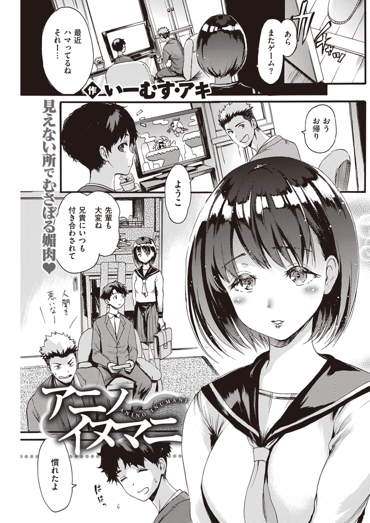 ちょっかいを出してくる男に睨みを利かせるシスコン兄の目を盗み先輩と付き合う黒髪ショートの美少女JK!トイレや野外の人目の付かない場所で手マンやフェラチオやクンニで乳繰り合い、兄の留守中に自分の部屋に呼び込んでイチャラブ中出しセックスして愛を育む!