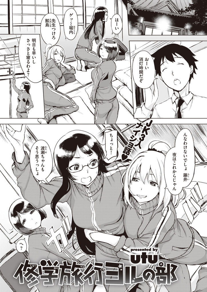 修学旅行の夜、思い出を作ろうとタイプの違うJK三人が部屋に集まり、二番目にヤバかったHの体験談を語り合う!話を盛った猥談で張り合う仲が悪い金髪ギャルと眼鏡の副委員長!その後で、彼氏に売られてハメ撮り二穴ファックされた一番過激な話を普通にする地味子でした!